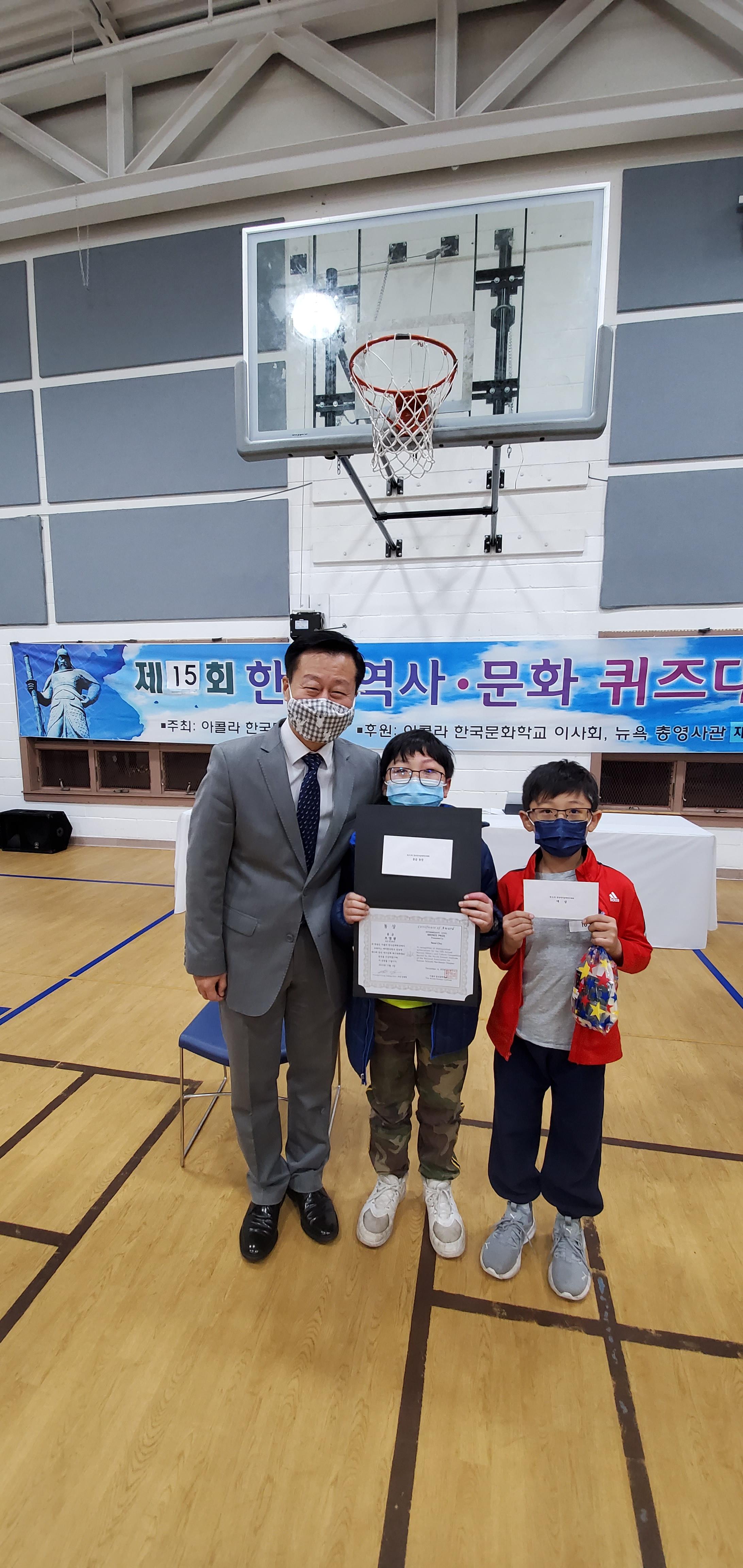 아콜라 한국문화학교에서 주최하고 뉴욕 총영사관과 재미한국학교 동북부협의회에서 후원하는 제 15회 한국 역사 문화 퀴즈대회에서 본교의 조은성 학생이 전체 대상과 조영광 학생이 초등부 동상을 수상하였습니다.